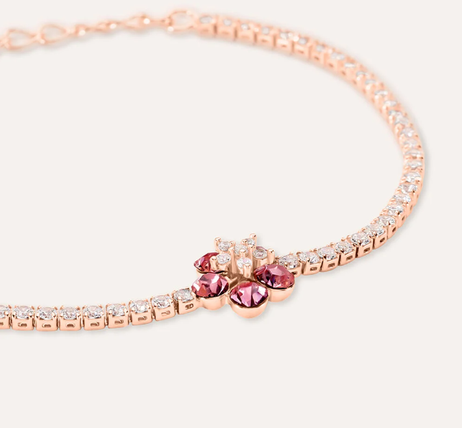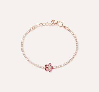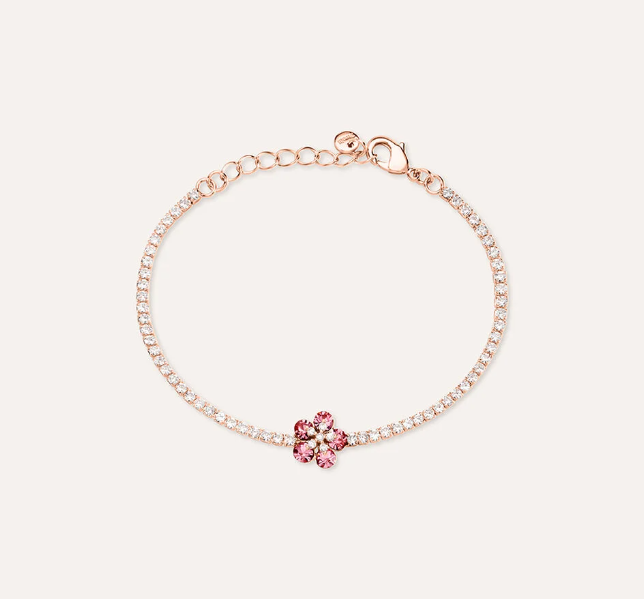 Bracciale delicato che cattura l'essenza della romanticità con fiori in cristallo rosa e bianco. Realizzato in ottone rosa, questo gioiello combina eleganza e femminilità in un design raffinato. La lunghezza regolabile di 16+3 cm si adatta perfettamente al tuo polso, garantendo comfort e versatilità. Ideale per chi desidera un accessorio che esprima sensibilità e stile, perfetto per occasioni speciali o per arricchire la collezione quotidiana con un tocco di brillantezza.