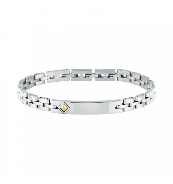 Bracciale Morellato che unisce acciaio inossidabile e placcatura oro giallo 750, creando un contrasto sofisticato e raffinato. Il design con dettagli pyramid e tag lo rende versatile e distintivo, perfetto per elevare qualsiasi look con un tocco di lusso autentico. Lunghezza regolabile 18+3 cm per una vestibilità confortevole. Indossa questo bracciale per esprimere personalità e eleganza in ogni momento della giornata. Codice SABY05.