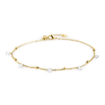 Immergiti nell'incanto dell'estate con la Cavigliera Marlù - Summer. Questo gioiello in acciaio con PVD oro esprime eleganza e raffinatezza, perfetto per valorizzare ogni tuo passo. I cristalli bianchi pendenti, di diverse dimensioni, si alternano a delicate sfere in acciaio, creando un gioco di luci che cattura l'attenzione. La lunghezza massima di 25.8 cm è regolabile grazie alla chiusura a scorrimento, assicurando una vestibilità personalizzata e confortevole. Indossa la cavigliera Marlù per aggiungere un tocco di glamour sofisticato alle tue giornate estive.