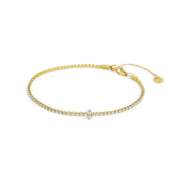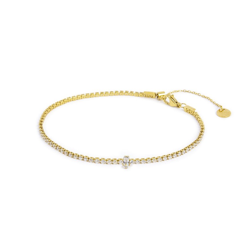Abbraccia il fascino dell'estate con la Cavigliera Marlù - Summer. Realizzata in acciaio pvd oro, questa cavigliera incanta con la sua catena tennis di 2 mm ornata da scintillanti cristalli bianchi. Al centro, un cristallo baguette bianco cattura l'attenzione, aggiungendo un tocco di eleganza. La sua lunghezza regolabile da 25,8 cm a 20 cm grazie a un pratico cursore, garantisce una vestibilità perfetta per ogni occasione. La chiusura a moschettone assicura comodità e sicurezza, mentre il tag logo Marlù aggiunge un dettaglio distintivo. Perfetta per chi desidera impreziosire ogni passo con stile e raffinatezza.