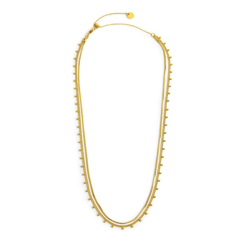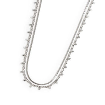 Elegante collana in acciaio che gioca su due livelli di design: il filo superiore scorre delicato mentre quello sottostante si anima di palline distanziate che catturano la luce con movimento naturale. Un'armonia di semplicità e dettagli raffinati che valorizza il collo con stile contemporaneo. Perfetta per chi ama gioielli versatili che passano dal giorno alla sera senza compromessi. La qualità dell'acciaio garantisce durabilità e brillantezza nel tempo.