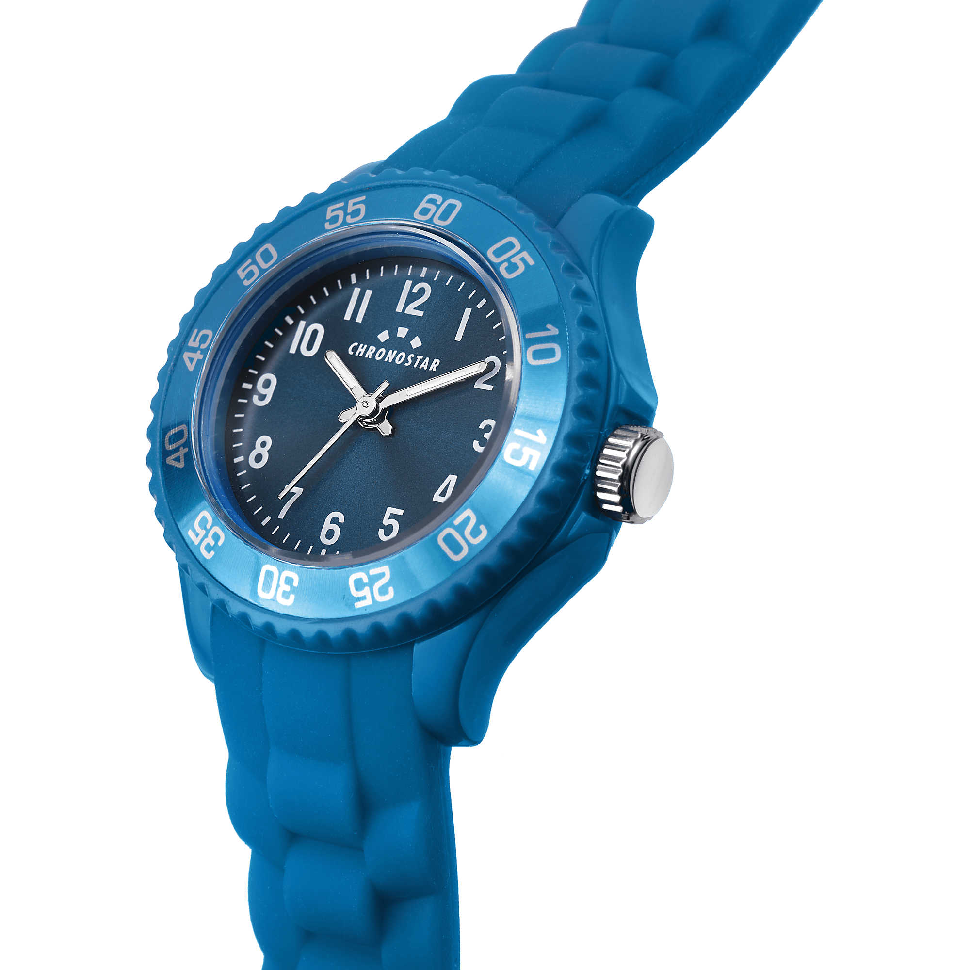 Questo orologio Chronostar unisce stile sportivo e comfort quotidiano grazie alla sua cassa e al cinturino interamente realizzati in silicone azzurro, morbido, leggero e resistente. Il quadrante presenta tutti i numeri ben visibili, assicurando una lettura immediata dell’ora, mentre la ghiera con marcature numeriche aggiunge un tocco dinamico e funzionale al design.