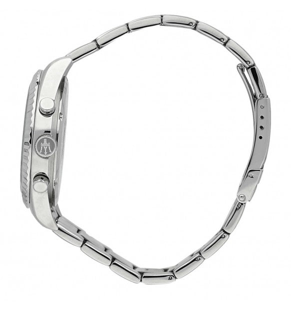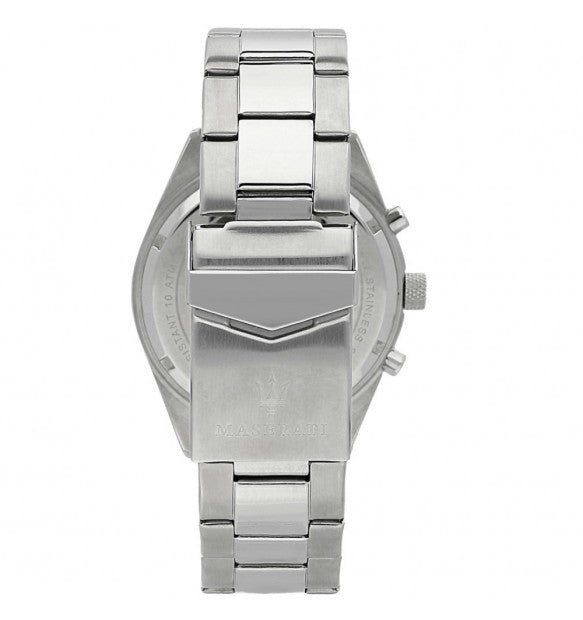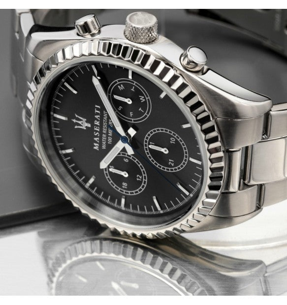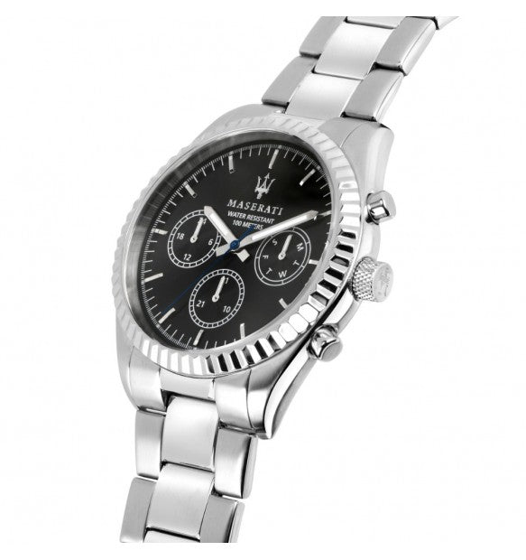 Orologio Maserati Competizione da uomo che unisce eleganza sportiva e affidabilità tecnica. La cassa in acciaio inox da 43 mm con lunetta zigrinata conferisce un'estetica decisa e moderna, mentre il quadrante nero con indici a bastoni e datario doppio garantisce leggibilità impeccabile. Corona e fondello a vite offrono una protezione superiore contro l'umidità, perfetto per chi non vuole compromessi. Il cinturino in acciaio anallergico silver con chiusura deployante di sicurezza combina comfort e durabilità. Resistente fino a 100 metri di profondità, è lo strumento ideale per chi ricerca uno stile sofisticato senza rinunciare alla funzionalità quotidiana.