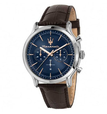 Scopri l'eleganza senza tempo con l'Orologio Uomo Maserati Epoca. Questo raffinato timepiece combina stile italiano e precisione svizzera. La cassa in acciaio inox da 42 mm ospita un affascinante quadrante blu con indici a bastoni e lancette rose gold, impreziosito dal prestigioso logo Maserati. Il cinturino in pelle marrone con fibbia ardiglione assicura comfort e versatilità, perfetto per ogni occasione. Resistente all'acqua fino a 100 metri, è il compagno ideale per chi apprezza la qualità costruttiva e il design sofisticato. Le funzioni cronografo e data completano una collezione che rappresenta il perfetto equilibrio tra tradizione e modernità.