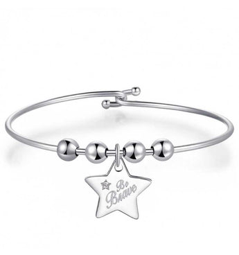 Bracciale rigido in acciaio 316L della collezione BE MY ALWAYS, caratterizzato da un elegante ciondolo a forma di stella impreziosito da cristallo. La stella reca l'incisione "Believe in yourself", un messaggio di forza e consapevolezza da portare sempre con sé. Il diametro di 60mm lo rende comodo e versatile, perfetto per chi desidera un accessorio che unisce stile contemporaneo e significato profondo. L'acciaio garantisce durabilità e resistenza nel tempo, mantenendo intatta la bellezza del gioiello giorno dopo giorno.