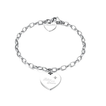 Bracciale in acciaio 316L con catena elegante e ciondolo a forma di cuore impreziosito da cristalli scintillanti. Il pendente presenta incisioni significative: "Follow your dreams" sulla fronte e "Dream" sul retro, perfetto per chi desidera portare con sé un messaggio di ispirazione quotidiana. La lunghezza di 18,5cm si adatta comodamente al polso, mentre l'acciaio garantisce durabilità e resistenza nel tempo. Un accessorio versatile della collezione BE MY ALWAYS che unisce stile contemporaneo e profondità emotiva, ideale come regalo speciale o per celebrare i propri obiettivi.