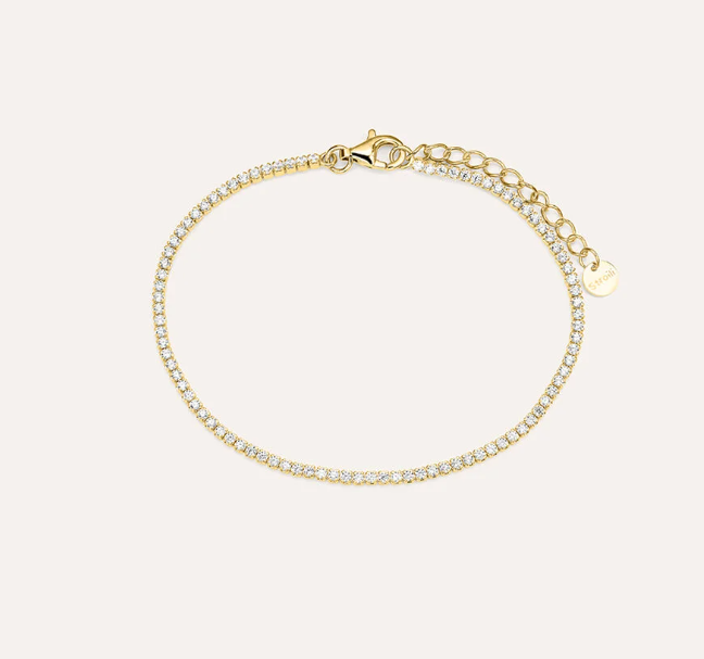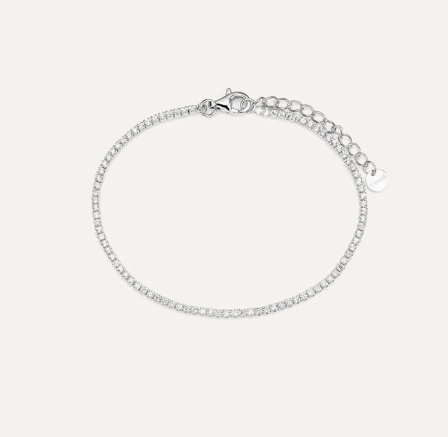 Bracciale Tennis Silver Elegance in argento 925 con cubic zirconia bianco brillante. Lunghezza regolabile 16+3 cm, perfetto per adattarsi al tuo polso con eleganza. Ogni pietra è sapientemente incastonata per catturare la luce e creare un effetto scintillante che valorizza ogni occasione. Il design senza tempo combina semplicità e raffinatezza, rendendolo un accessorio versatile da indossare quotidianamente o per momenti speciali. Realizzato con materiali di qualità, garantisce durabilità e splendore nel tempo. Un'aggiunta essenziale alla tua collezione di gioielli.