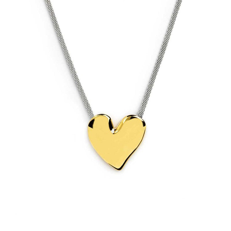 Collana Marlù Vision in acciaio PVD oro che unisce eleganza e versatilità. La catena mesh delicata sostiene un ciondolo a forma di cuore irregolare martellato, che cattura la luce con movimento affascinante. Regolabile da 39 a 44 cm tramite cursore, si adatta perfettamente a ogni occasione e stile personale. Un accessorio sofisticato che valorizza il tuo look quotidiano con un tocco di raffinatezza senza tempo.