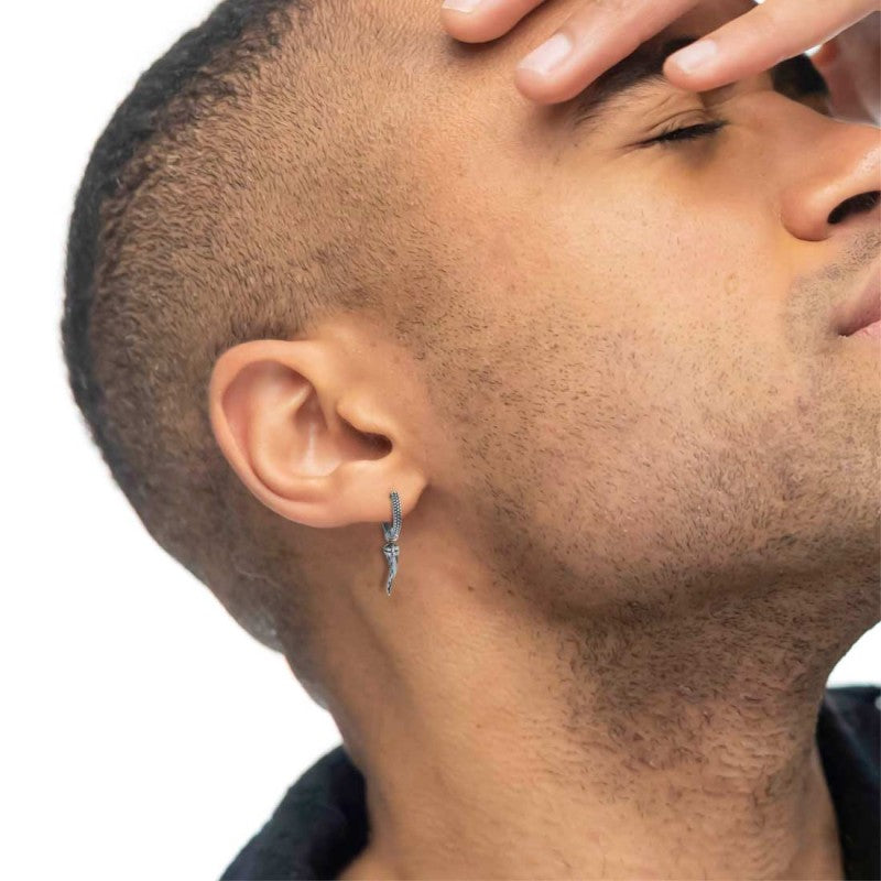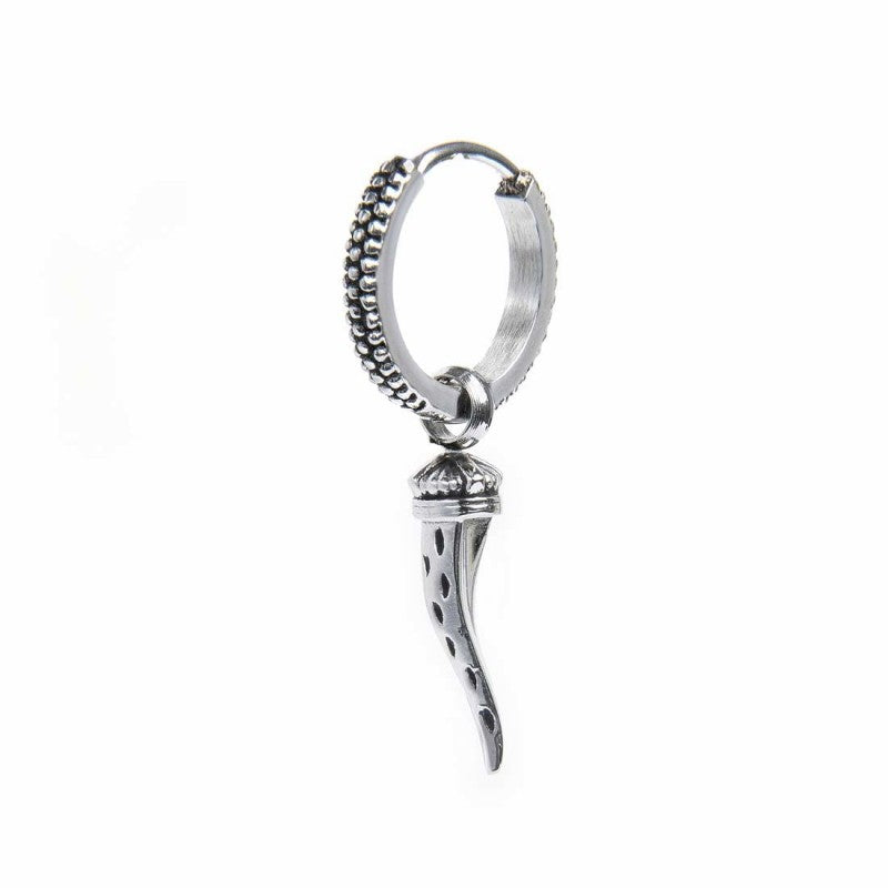 Un tocco di stile e audacia per l'uomo moderno con il Mono orecchino Marlù - Vision. Realizzato in acciaio inossidabile, questo orecchino presenta un design a cerchio con un diametro di 1,5 cm e una trama puntinata in raffinato black oil opaco. Il pendente a forma di corno aggiunge un elemento unico e distintivo, anch'esso caratterizzato dalla trama in black oil. Con una lunghezza totale di 3,1 cm, l'orecchino è dotato di una chiusura a pressione che garantisce sicurezza e comfort. Perfetto per chi desidera esprimere personalità e carattere, questo accessorio è un must-have per ogni collezione di gioielli maschili.
