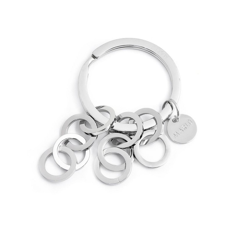 Portachiavi con anello di 30 mm in acciaio, contenente tre catene di lunghezze diverse con anelli piccoli e targhetta con logo Marlù.
