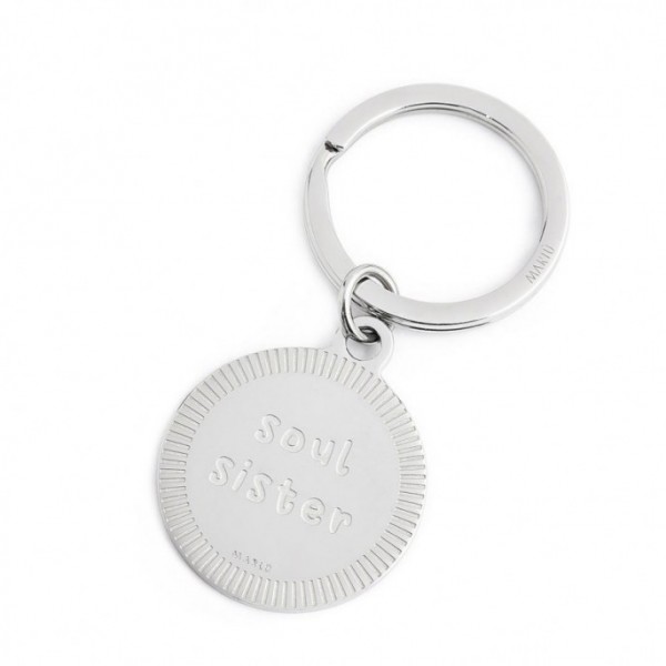 Portachiavi con anello di diametro 30 mm in acciaio, con pendente tondo con al centro il simbolo dell'infinito. Sul retro è presente la scritta incisa "soul sister", Marlù logo inciso nella parte inferiore.