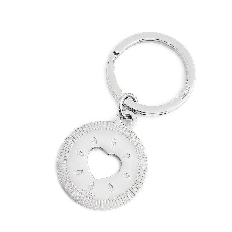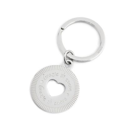 Portachiavi con anello di diametro 30 mm in acciaio, con pendente con cuore forato al centro. Sulla parte frontale attorno al cuore la scritta "Grazie di cuore". Marlù logo inciso sul retro nella parte inferiore.