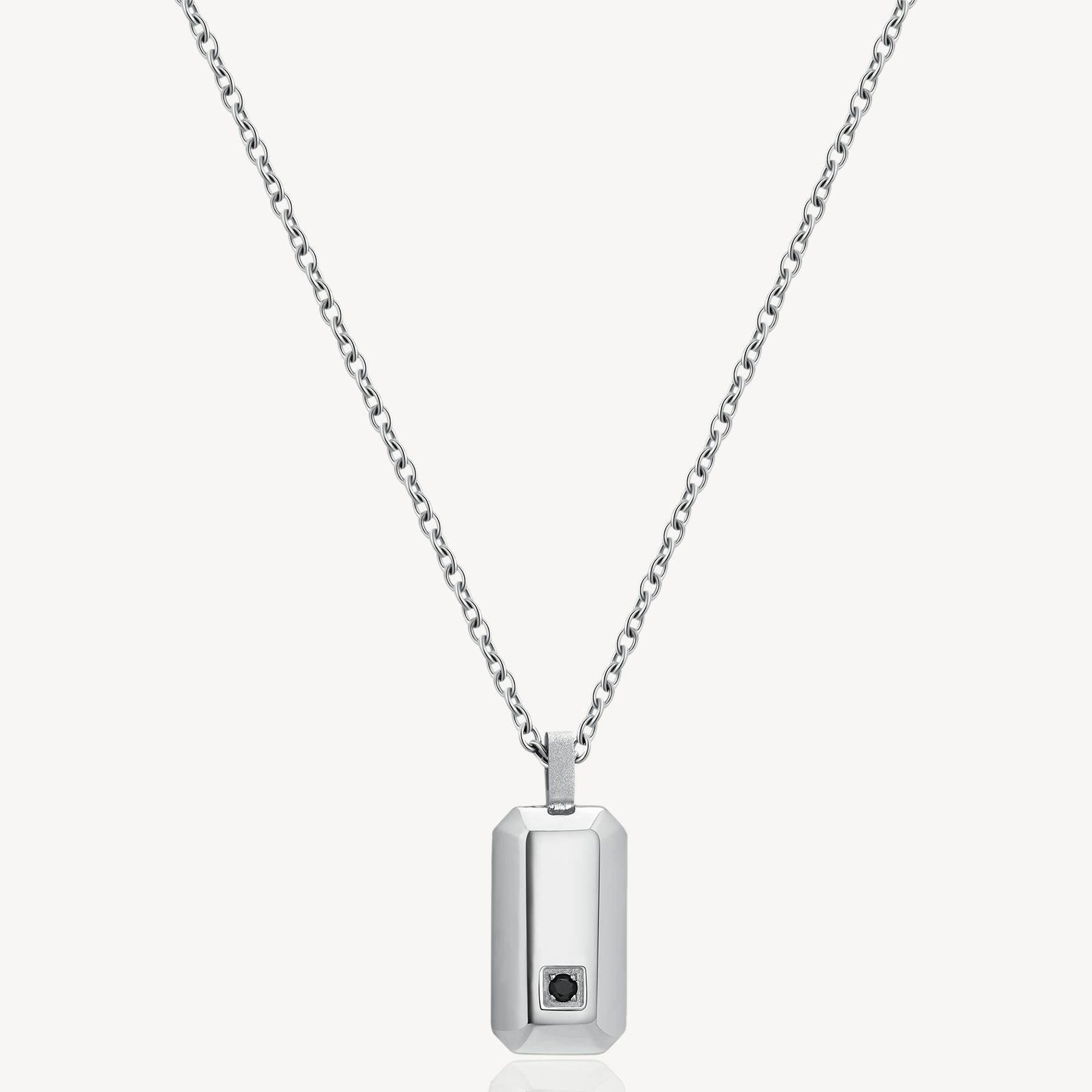 Collana girocollo in acciaio 316L con pendente a forma di tag e cristallo nero.