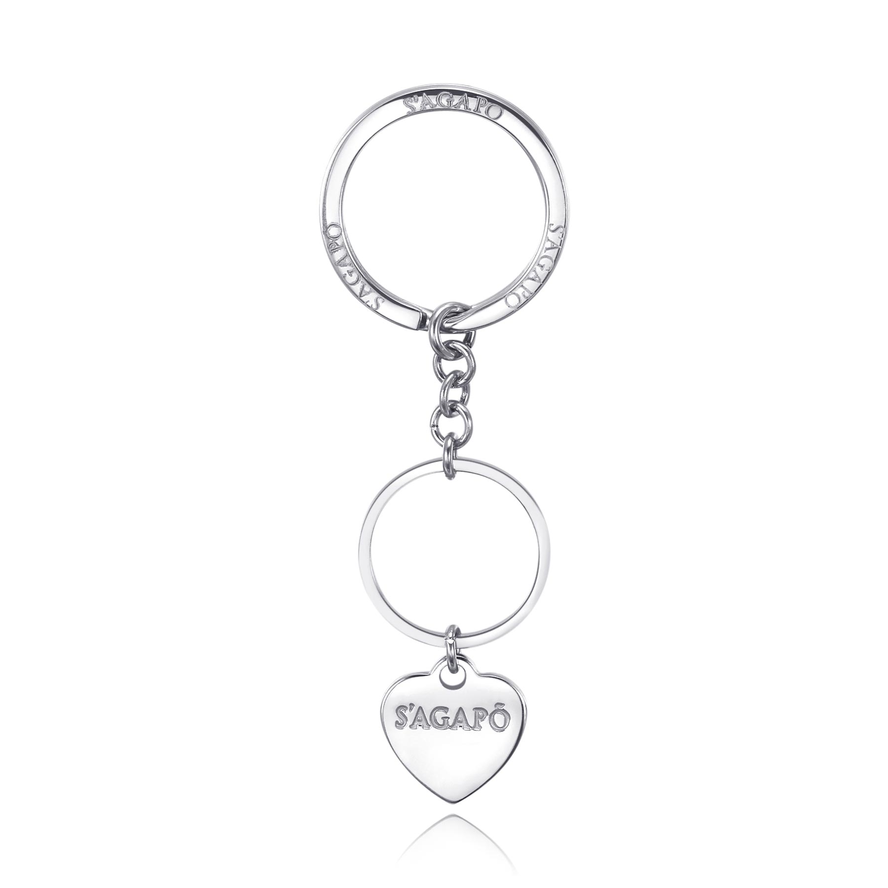 Portachiavi in acciaio con doppio cerchio e ciondolo a forma di cuore con scritta sagapò.